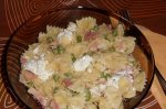 Mazarea se fierbe impreuna cu pastele (am avut congelata, s-a fiert atat cat trebuie), apoi se dau sub un jet de apa rece si se lasa de-o parte. In acest timp, intr-o tigaie antiaderenta se caleste usor usturoiul cu pancetta taiata fasii, cateva miniute.  Se adauga pastele, mazarea...