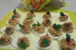 Am fiert ouale tari. Le-am taiat in doua si am scos galbenusurile. Am tocat foarte marunt ardeiul. Intr-un bol am amestecat galbenusurile cu pateul , ardeiul si patrunjelul, si am sarat. Am facut maioneza la care am adaugat 2 linguri de smantana si sare dupa gust. In tava am intins...