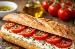 Bagheta o tai în două pe lungime, o ungi cu cremă de brânză şi aşezi salata. Pui feliile de mozzarella alternativ cu rondelele de roşii şi ornezi cu frunze de busuioc proaspăt. Cost/porţie: 3-5 Lei Timp de preparare: max. 5 minute