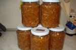 Spalam ardeii si ii taiem felioare.La fel procedam si cu cotoarele de telina,hreanul si telina le radem si amestecam totul intr-un castron,presaram zaharul si turnam otetul peste,lasam pana a doua zi cand ,acest amestec il punem in borcanele.Mi-au iesit 9 borcanele de 400 g.