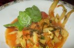 Curatati dovlecelul si taiati-l cubulete sau bastonase, apoi puneti-l la calit in ulei intr-o craticioara. Intre timp curatati si taiati cubulete ardeiul si rosiile (ceapa). Dupa cateva minute adaugati totul peste dovlecei. Condimentati si lasati sa fiarba la foc mic 10 minute. Adaugati frunzele...