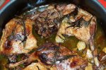 1. Spalati si uscati bine pulpele cu un prosop de bucatarie. 2. Presarati cu sare pe toate partile si asezati pulpele intr-un vas, cu pielea in jos. 3. Adaugati apa, sucul de portocale, coniacul si Mirodenia. Apoi usturoiul in coaja, taiat transversal si stropiti cu ulei. Aranjati ramurelele...