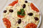Punem cartofii la fiert in apa cu sare. Dupa ce s-au fiert taiem cartofii cuburi,ceapa solzisori,maslinele rondele,muraturile cubulete mici.Adaugam maioneza,mustarul, sarea, otetul si uleiul.Amestecam bine toate si punem salata pe un platou sau pe o farfurie, punem pe deasupra doua...