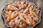 Se amesteca toate ingredientele, apoi se pune faina si se framanta 5-10 minute (trebuie sa fie un aluat moale cu care sa se poata lucra usor). Se intinde o foaie aproximativ 0,5 cm si se taie in romburi apoi la mijloc se cresteaza cu varful cutitului si se baga unul din capete prin acea taietura...