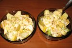 Fructele le curatam de coaja, le spalam si le taiem rondele. In desertul de la restaurant era si banana, deci puteti face si cu banana daca va place, o taiati pe jumatate. Se face un amestec din oua si faina, putin mai gros, apoi se subtiaza cu laptele, se adauga praful de sare si zaharul...