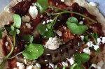 Piadina cu carnat la gratar, ketchup afumat, nasturel, rosii uscate si branza de capra cu ierburi