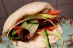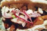 Pita umpluta cu burta de porc la cuptor, ananas caramelizat, ceapa murata si branza feta