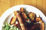 Carnati Thüringer cu gratin de cartofi dulci cu branza albastra