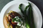 Se ung somonul si sparanghelul cu ulei de masline si se presara cu sare si piper. Se aseza intr-o tava nu foarte mare si se coc 10-15 minute.