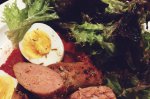 Piure de cartofi cu sfecla, carnati, oua si fenicul