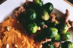 Piure de cartofi dulci cu varza de Bruxelles, carnati de pui, pere si za'atar