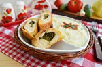 Pentru foi, amestecăm ouăle cu sarea până se spumează, adăugăm coniacul, oțetul și apa și amestecăm din nou până se omogenizează compoziția. Cernem făina într-un vas și adăugăm peste ea untul rece tăiat în cuburi. Amestecăm untul cu făina, cu...