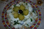 Cartofii se curatata si daca sunt mari se taie in doua, se fierb in apa sarata cam pe 3 sferturi. Se scot apoi si se scurg intr-o sita. Ouale se fierb tari, cam 7-8 minute, apoi se lasa in apa rece 5 minute. Cartofii se taie bucati mai mici si se prajesc in ulei de porumb, apoi se pun intr-un...