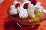 Spalam fructele, le curatam si le taiem cubulete. Le punem intr-un vas si adaugam compotul, cateva nuci tocate, cateva stafide, esenta de rom, siropul din compot. Se tine la frigider cel putin 2 ore inainte de servire. Se orneaza cu frisca si zmeura.