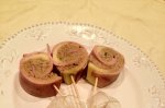 Feliilor de toast le-am taiat coaja si le-am asezat una langa cealalta. Deasupra lor am asezat felii de cascaval. Am operit cascavalul cu felii de sunca. Am incalzit in cuptorul cu microunde timp de cateva secunde. Cald fiind sandwich-ul a fost usor de rulat. Ruloul format l-am fixat cu 3...