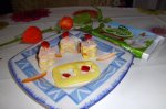 Pepenele galben se taie feliute. Se adauga musli. Se decoreaza cu branza.