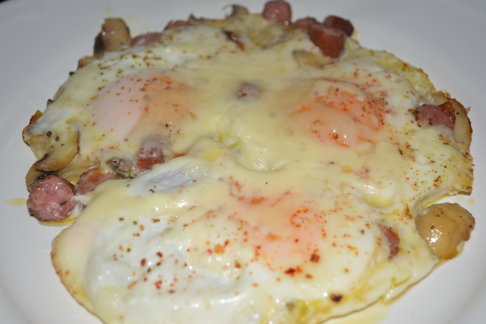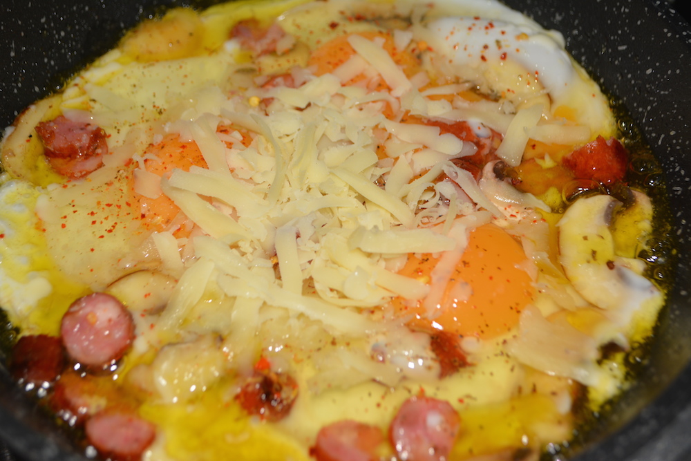 Prima oara am aruncat in noua tigaie felii subtiri de ciuperci, apoi am adaugat bucatele de cabanos, care si-au lasat grasime invaluind bucataria de aroma. Cind s-au rumenit, a venit rindul celor 3 oua sa plonjeze in Regis Stone, iar ploaia de cascaval a inchis recitalul. I-am pus deasupra un capac pentru citeva minute, iar ce a iesit vedeti mai jos: