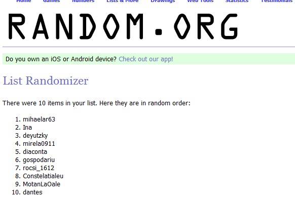 Bucatarasi harnici, nu stiu cat de impresionate ar fi nevestele de retetele inscrise de voi la acest concurs haios, dar eu am fost tare impresionat. A fost un duel pe cinste, iar primii 10 dintre voi in ordinea aprecierii de public au intrat in tragerea la sorti (in situatiile astea sunt bucuros ca un program trebuie sa faca alegerea, pentru ca ar fi foarte greu de decis).