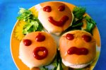 chifla o taiem in jumatate pe lung. pe jumatate punem o felie brinza topita intoarsa la colturi,o felie rosie,o felie salam si 3-4 feliutze catofi prajiti. aseazam peste acestea cealalta parte din chifla si cu ketchup desenam diferite figuri :)