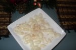 Pregatim o oala cu 2 l apa clocotita in care punem pastele lasandu-le 7-8 minute la foc potrivit.Le scoatem intr-o strecuratoare mare si le trecem sub un jet de apa rece pentru a nu se lipi intre ele. In aceeasi oala in care au fiert pastele,punem laptele si cand a ajuns la punctul de fierbere...