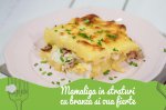Prepara mai intai mamaliguta. Pune apa la fiert cu sarea. Cand clocoteste adauga laptele fierbinte Amesteca in continuu cu un tel si adauga malaiul "in ploaie". Lasa sa fiarba la foc mediu cateva minute, amestecand din cand in cand, ca sa nu se lipeasca....