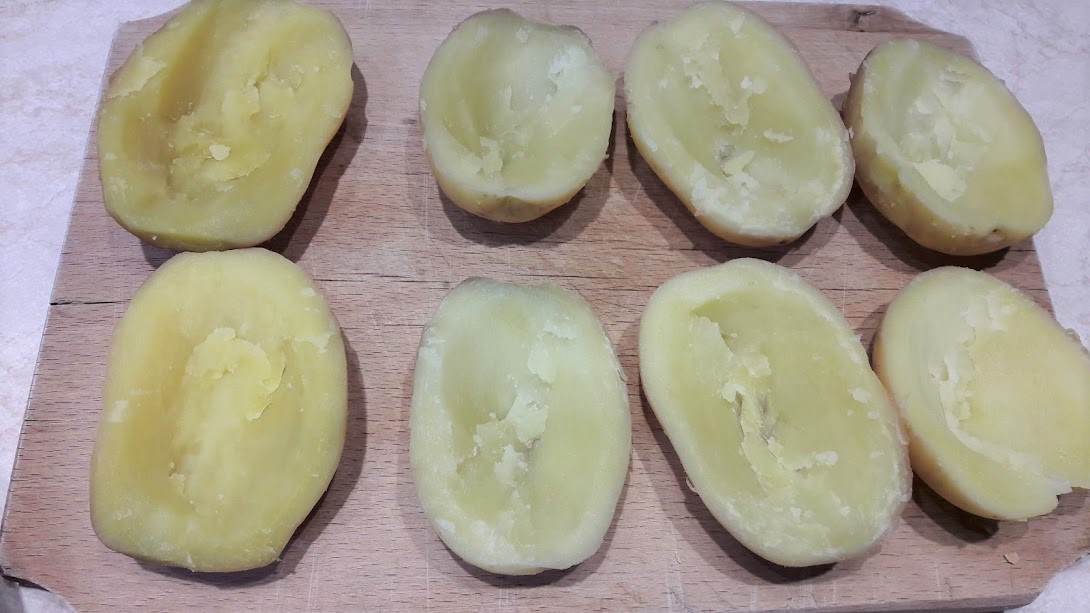 Aperitiv cartofi umpluti cu mozzarella si ou fiert, inveliti in bacon