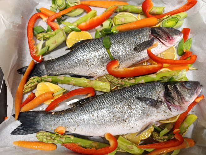 Biban de mare cu sparanghel, ardei și baby morcov - Rețeta rapidă și sănătoasă