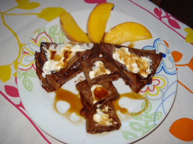 Clatite cu budinca de ciocolata si piersici garnistite cu frisca si crema caramel