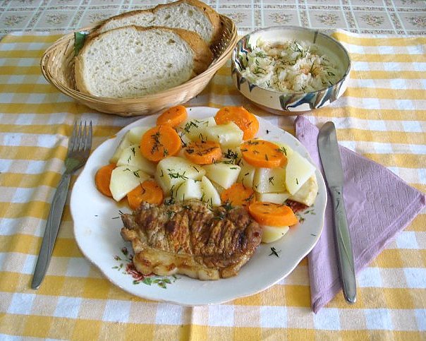 Cotlet de porc (vrabioara) la tigaia grill, cu legume gatite la abur si salata de varza dulce