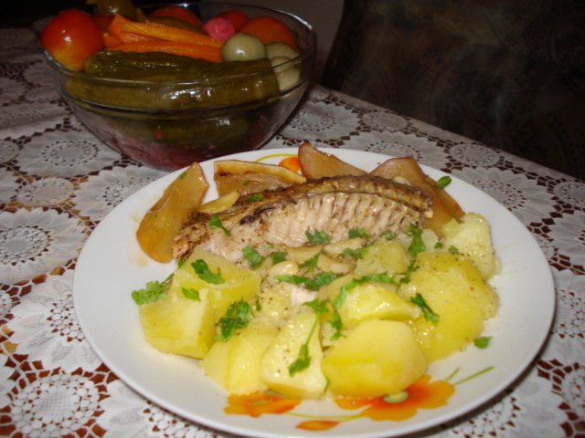 Crap la cuptor cu mere, lamaie si suc de portocale