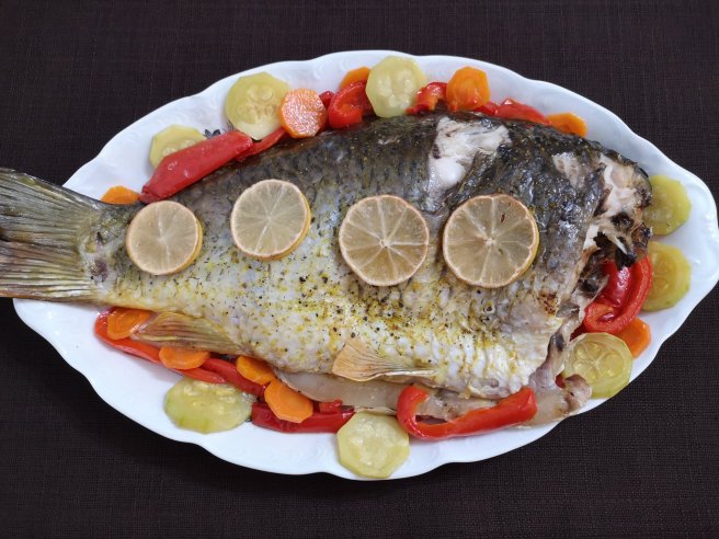 Crap pe pat de legume, la cuptor