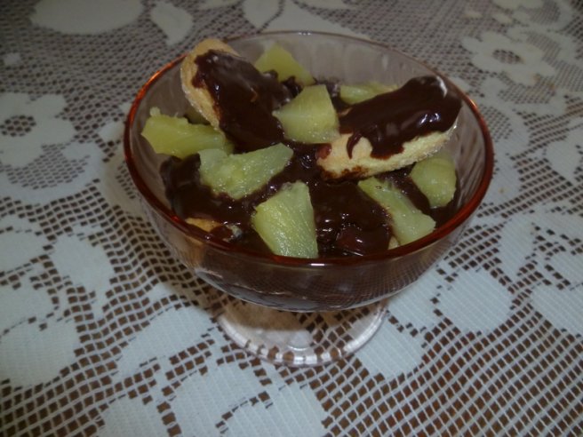Desert cu piscoturi si budinca de ciocolata cu ananas