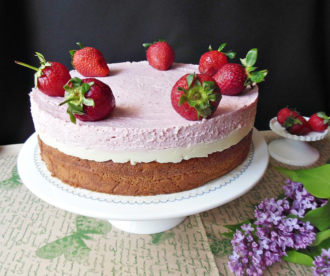 Desert prajitura cu crema de lapte si mousse de capsuni
