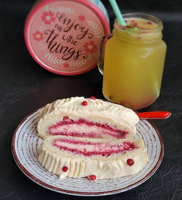 Desert rulada cu blat din albusuri, jeleu de merisoare si crema de lamaie
