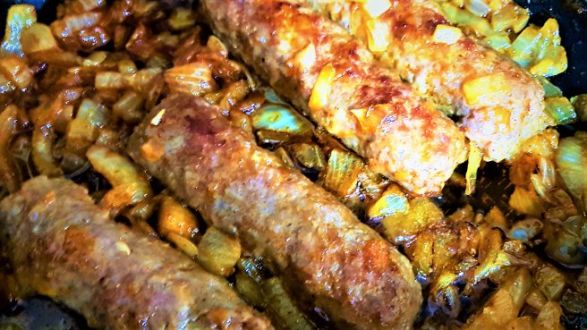 Fasole alba cu mititei in sos de ceapa