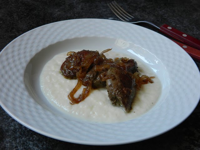 Ficat de curcan cu piure de conopida si ceapa caramelizata