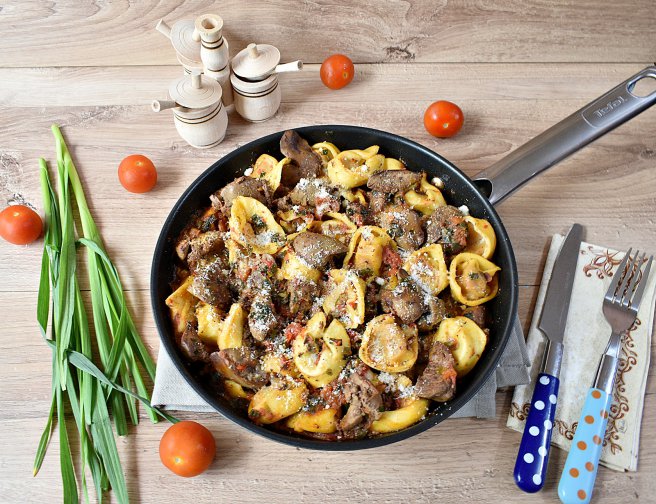 Ficatei de pui cu tortellini, ceapa verde si rosii-1