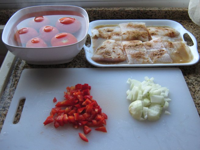 Fileu de peste prajit cu garnitura de rosii scazute(" Iahnieh bandora") si cartofi prajiti ("Mfarakeh batatas")