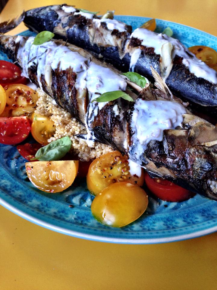 Macrou cu salata de quinoa si rosii si sos de iaurt cu hrean