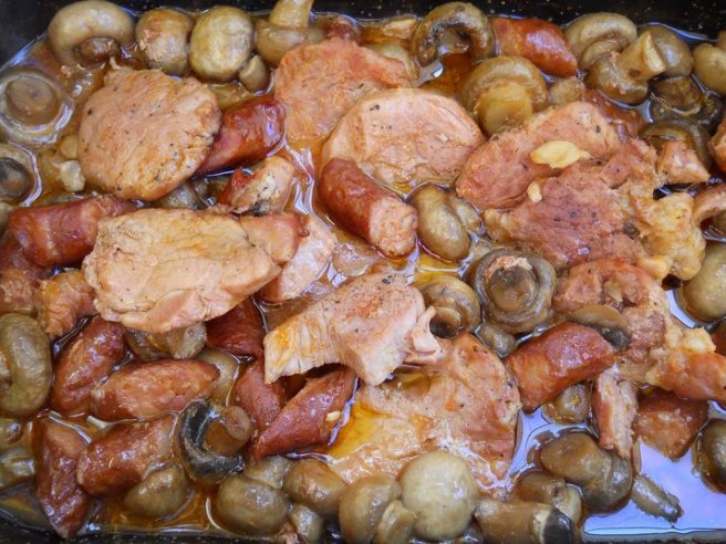 Muşchi cu cârnaciori afumaţi şi ciuperci la cuptor-1