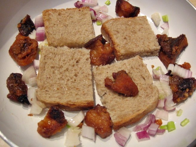 Omleta cu jumari, ceapa rosie si paine toast-4