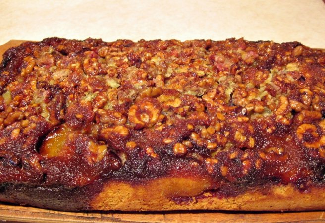 Prajitura rasturnata, cu prune, zahar ars si nuci