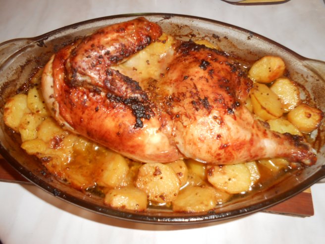 Pui imbracat in mustar frantuzesc pe pat de cartofi