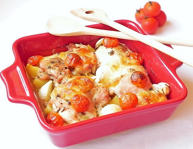 Pulpe de pui cu cartofi si rosii la cuptor-1