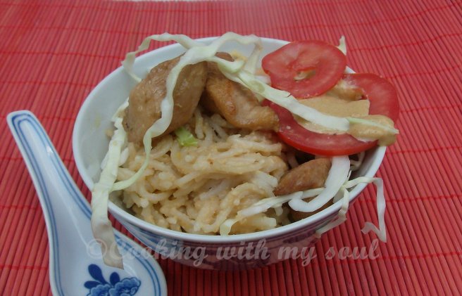 Salata asiatica cu pui, taietei si sos de arahide facut in casa