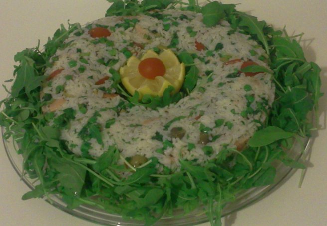 Salata de orez cu somon afumat,rosii chery si rucolla