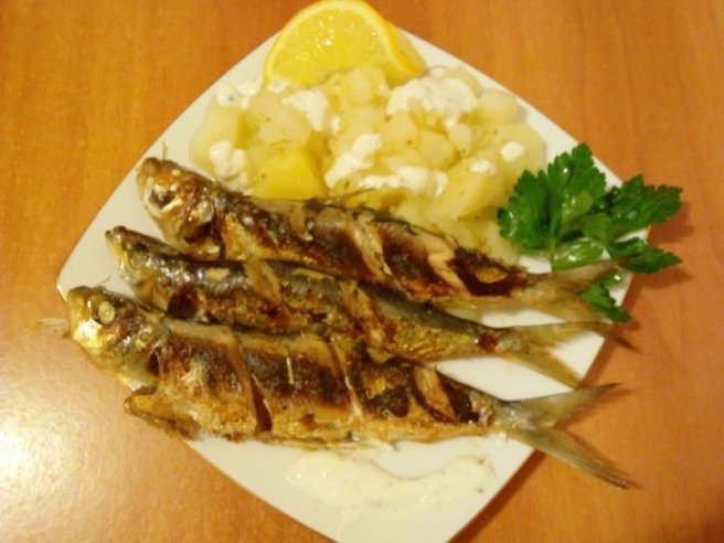 Sardine fripte pe grill cu cartofi natur și sos de usturoi