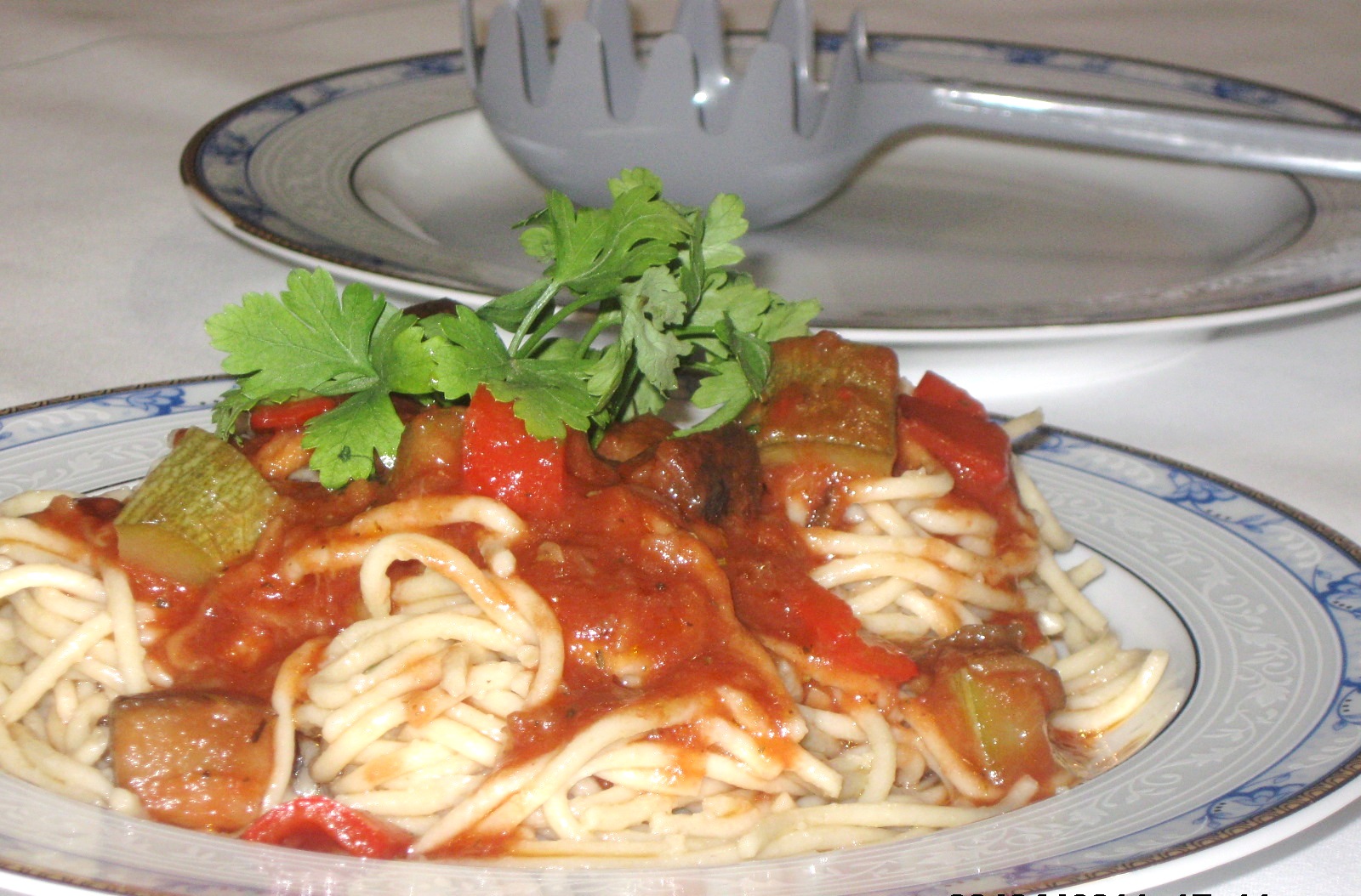 Spaghetti in sos de rosii cu vinete , dovlecei si ardei gras-1