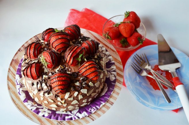 Tort cu ciocolata, banane si capsuni