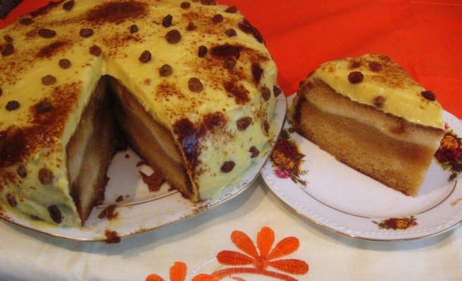 Tort cu crema de zahar ars, crema de vanilie si stafide